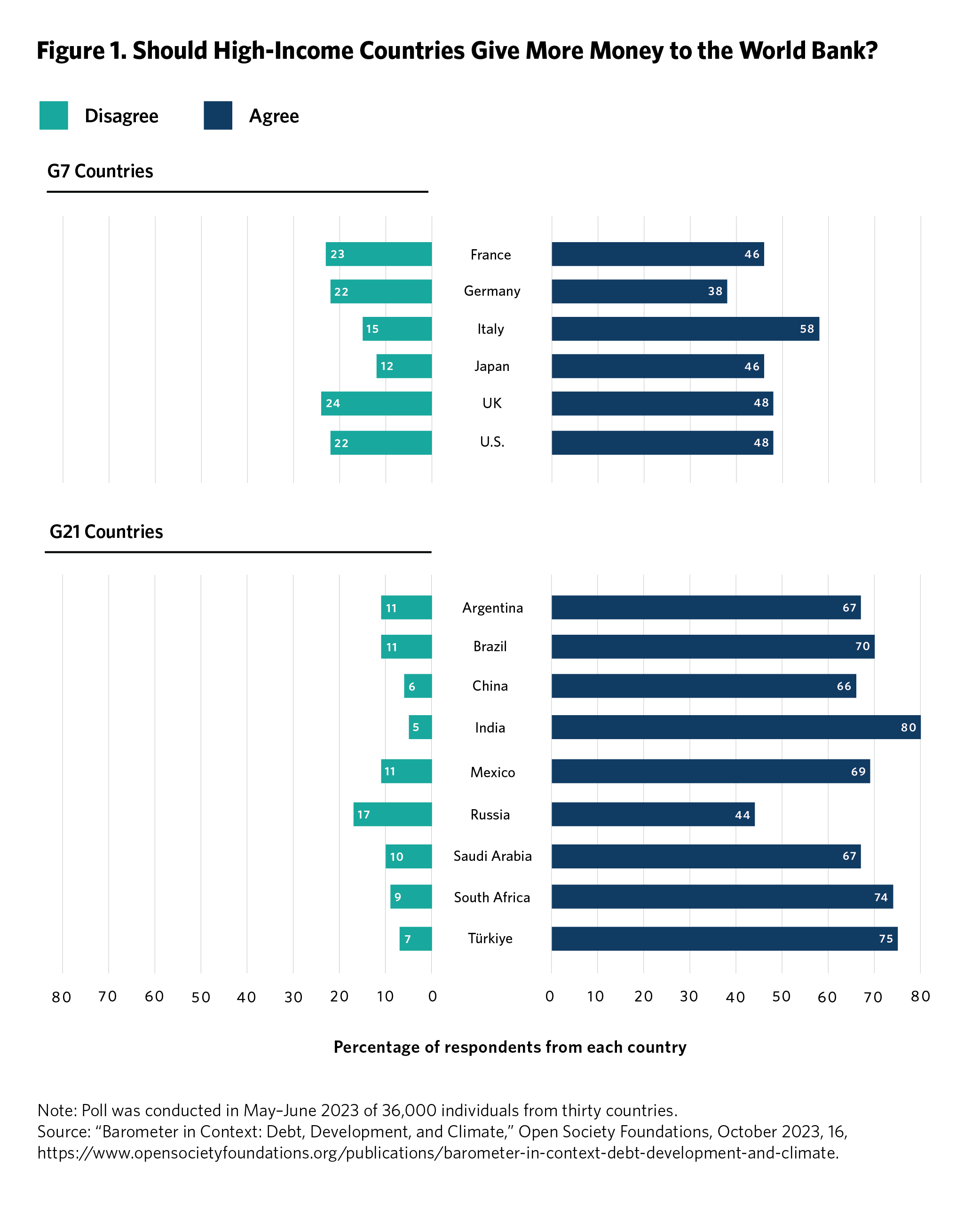 Public polling across a range of countries shows widespread support for the idea that governments should spend 2 percent of GDP on “People and Planet”: investments that protect the environment and contribute to human development. Over a third support the proposal in G7 countries and as much as 70 percent support it in African countries.3 As shown in Figure 1, support for giving the World Bank more money to respond to global crises sits between 38 percent and 58 percent in G7 countries and between 44 percent and 80 percent in selected G21 countries.